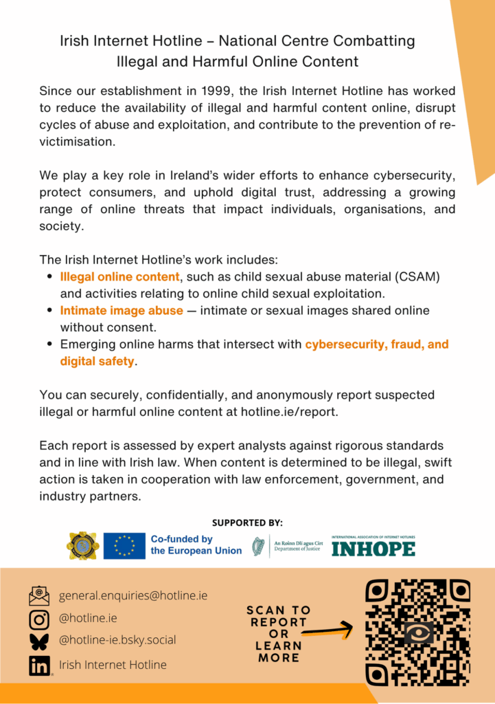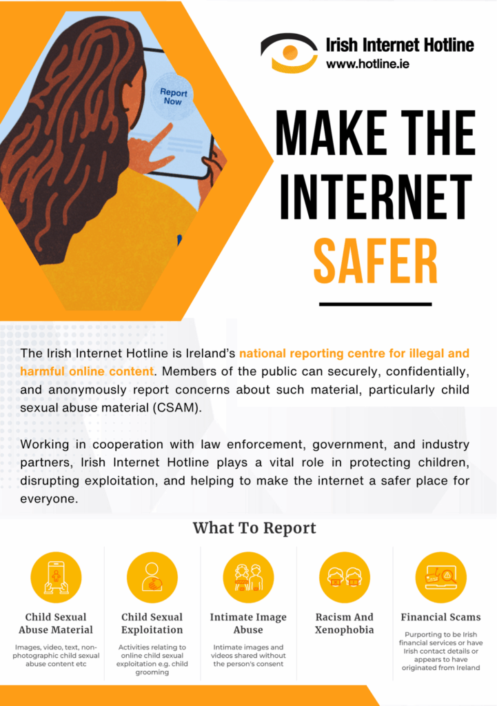 The team at Hotline.ie works to reduce the prevalence of illegal content online, break the cycle of abuse and exploitation, and prevent repeat-victimisation of those who have suffered from abuse.